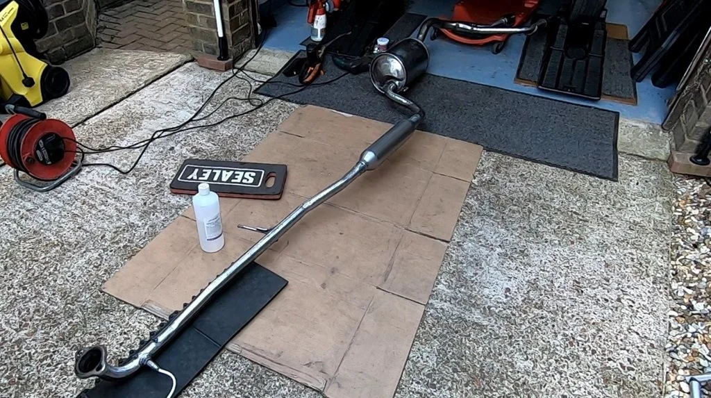 The original pipe and silencer were covered in rust; however, no corroded areas had formed holes or cracks. The entire exhaust system was sanded to remove the rust, then polished, and finally protected with a transparent VHT clear paint coat.