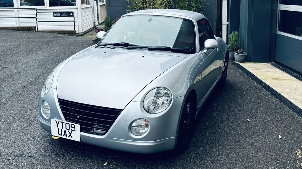 Our second demonstrator is this Daihatsu Copen. We acquired it in 2021 with 54,000 miles on it. At the time, the exterior and underbody were in poor condition, but the mechanical aspects were decent. We immediately began the restomod process, using a combination of stock replacement parts and components from well-known tuners. Our goal is to transform it into a street car by following the invaluable advice of several Copen tuners in Japan. The project is ongoing.