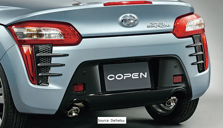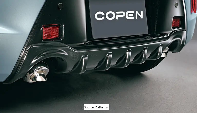 This kit is a DAIHATSU original option part. It includes the rear lower garnish (diffuser look), front louvres, and rear louvres. These items can be purchased separately until the manufacturer's stock lasts.