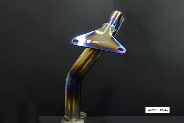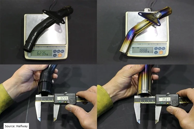 Titanium is used to replace the stock pipe. By using a 1mm thick titanium pipe, the inlet and outlet diameters are increased by approximately 3mm compared to the stock pipe, and the weight has been reduced from 623.5g to 188.8g, approximately one-third of the stock pipe's weight.